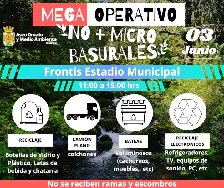 ANGOL.- Entre las 11 y las 15 horas, del próximo sábado 3 de junio, se realizará un nuevo mega operativo de limpieza en frontis del Estadio Alberto Larraguibel Morales, llamado  “No más micro basurales”. La actividad es organizada y programada por Departamento de Aseo, Ornato y Medio Ambiente de la Municipalidad.